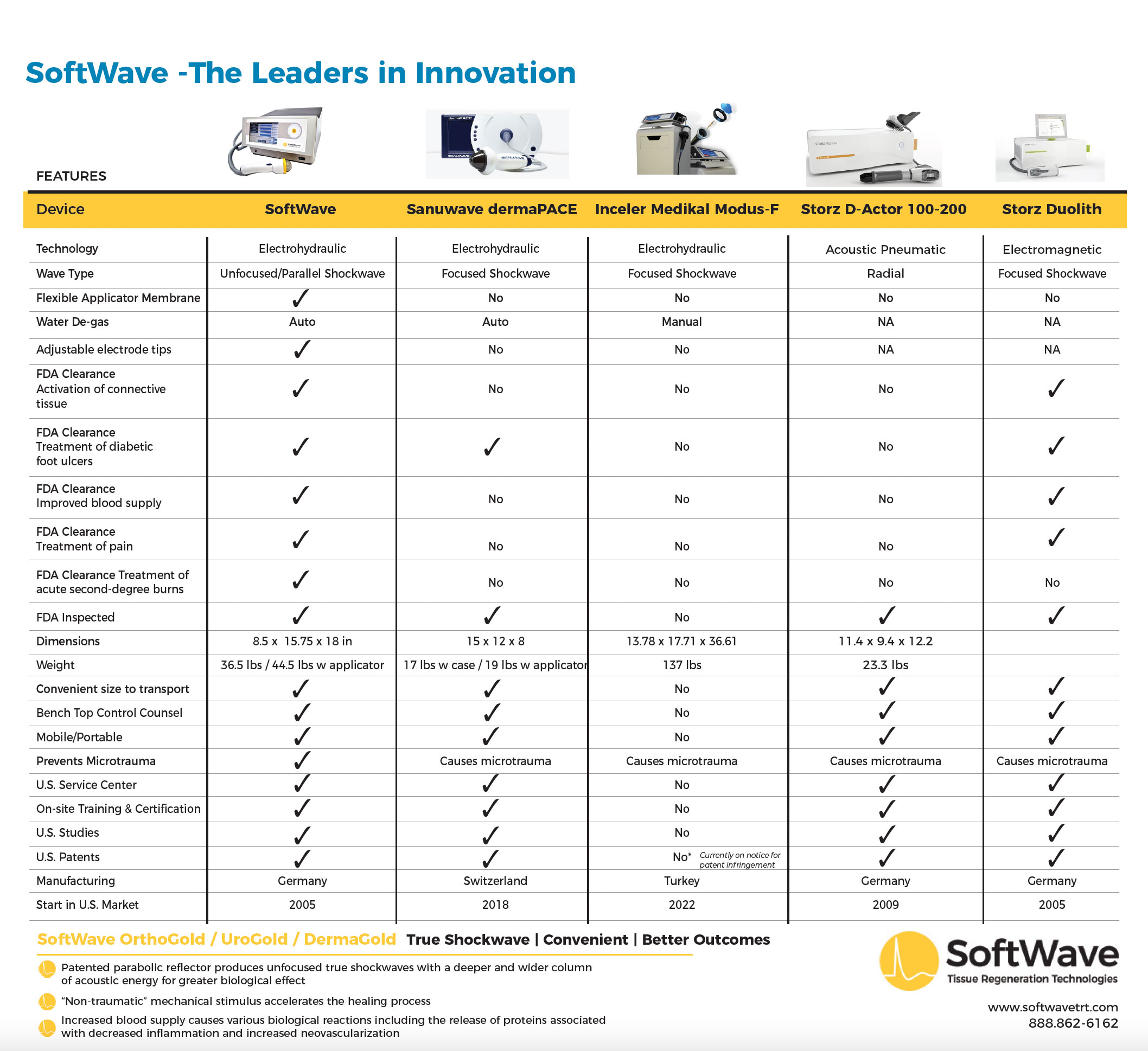 SoftWave reaches up to 7 cm wide and 12 cm deep, giving more complete coverage of the injured area and often requiring fewer appointments.